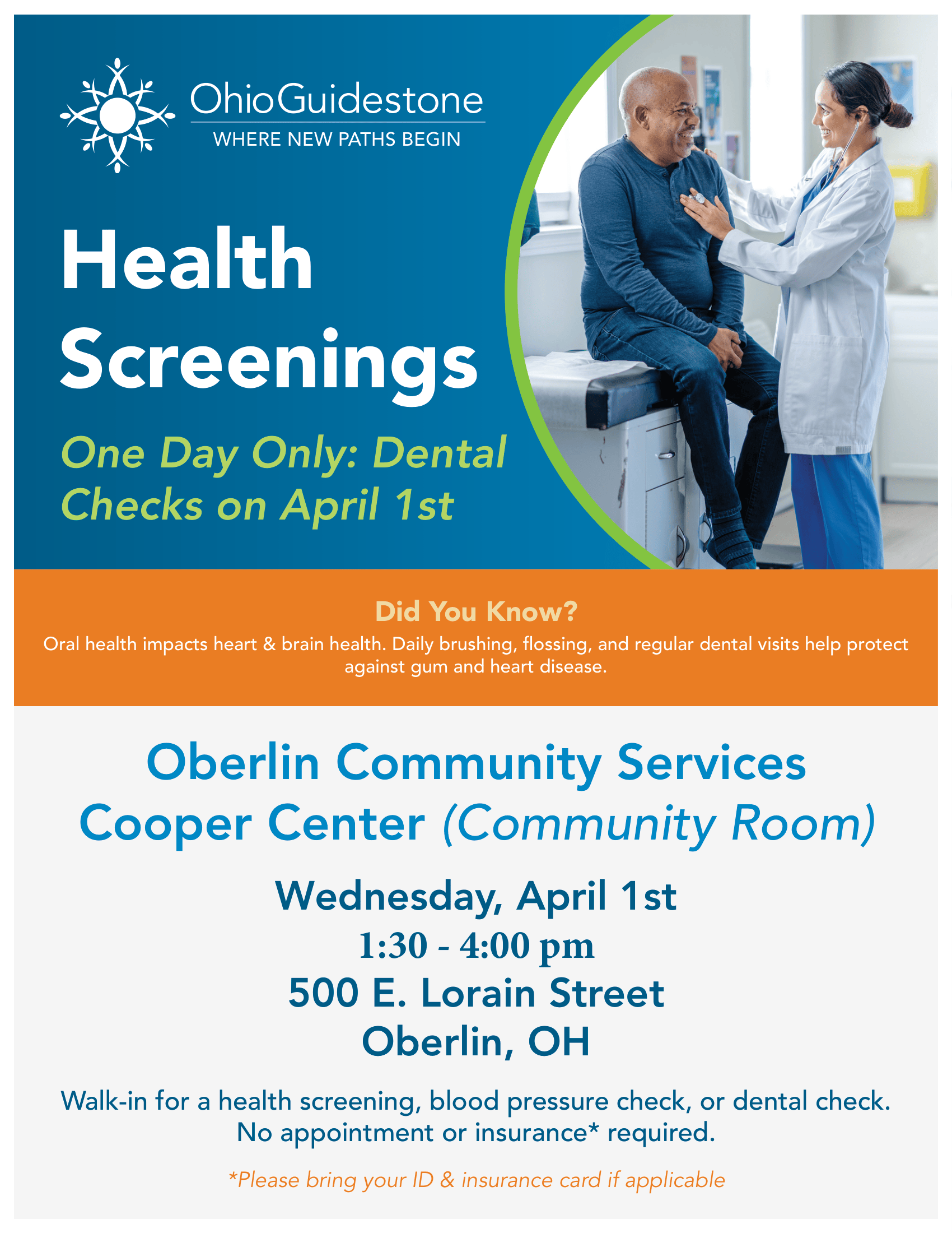 OhioGuidestone, one of the partners that shares the Cooper Community Resource Center with OCS, will offer FREE dental checks during food pantry hours on Wednesday, April 1. They’ll have qualified health staff on hand from 1:30-4 p.m. to offer oral screenings. NO APPOINTMENT OR INSURANCE IS NEEDED, but please bring your ID and insurance card if applicable. Just walk in — it’s super easy! Free health screenings will be offered in the Ann Fuller Great Space, which is our large community room just off the main lobby.